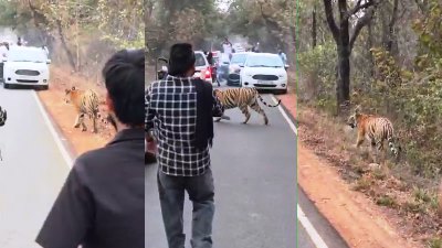 बाघ दिखा तो भूल गए नियम, सड़क पर लगा गाड़ियों का रेला मेला,बाघ के करीब पहुंचे लोग